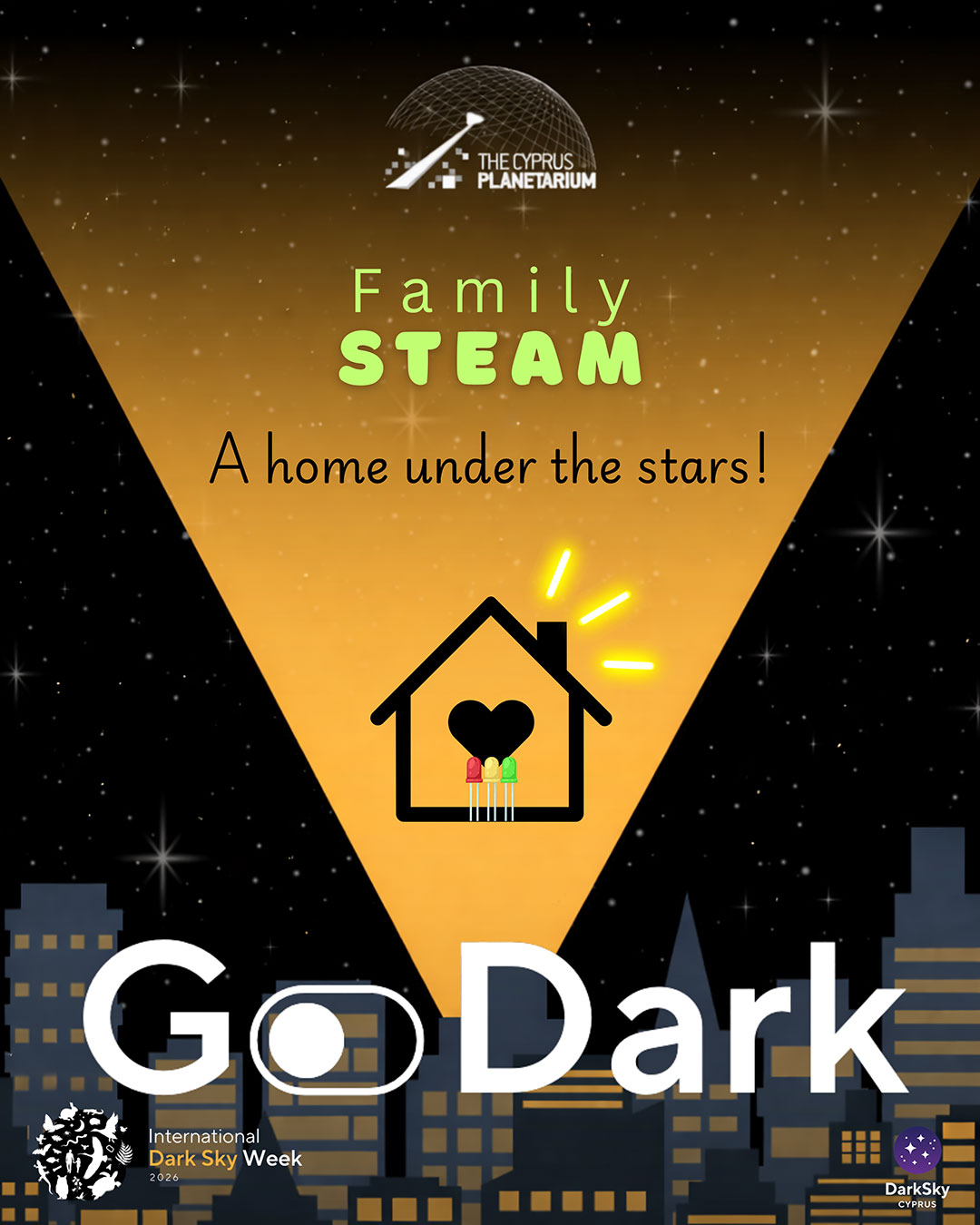 Ένα βιωματικό οικογενειακό εργαστήριο όπου παιδιά και γονείς/κηδεμόνες συνεργάζονται για να σχεδιάσουν και να κατασκευάσουν ένα πρότυπο σπίτι, εφαρμόζοντας πρακτικές φωτισμού φιλικές προς τον έναστρο ουρανό. Η δραστηριότητα αναδεικνύει πώς ο σωστός σχεδιασμός φωτισμού μειώνει τη φωτορύπανση, ενώ η τελική δημιουργία λειτουργεί ως ένα απαλό φωτάκι νυκτός—προάγοντας τις αρχές της βιωσιμότητας, της συνεργατικής μάθησης και της διαγενεακής αλληλεπίδρασης.